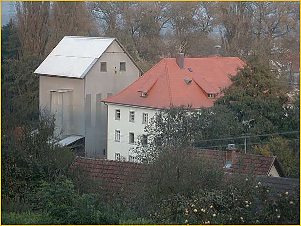 Links der Getreidespeicher und die Getreideannahme, rechts das Mühlengebäude Im Hintergrund der Schwarzwald. Seit nachweislich mindestens 700 Jahren existiert eine Mühle an dieser Stelle.